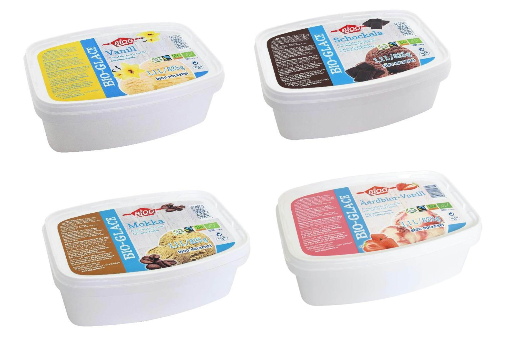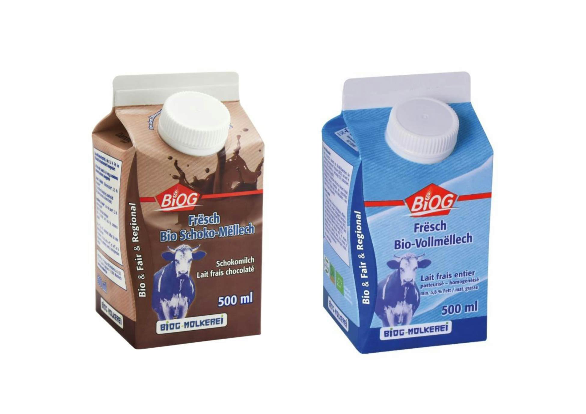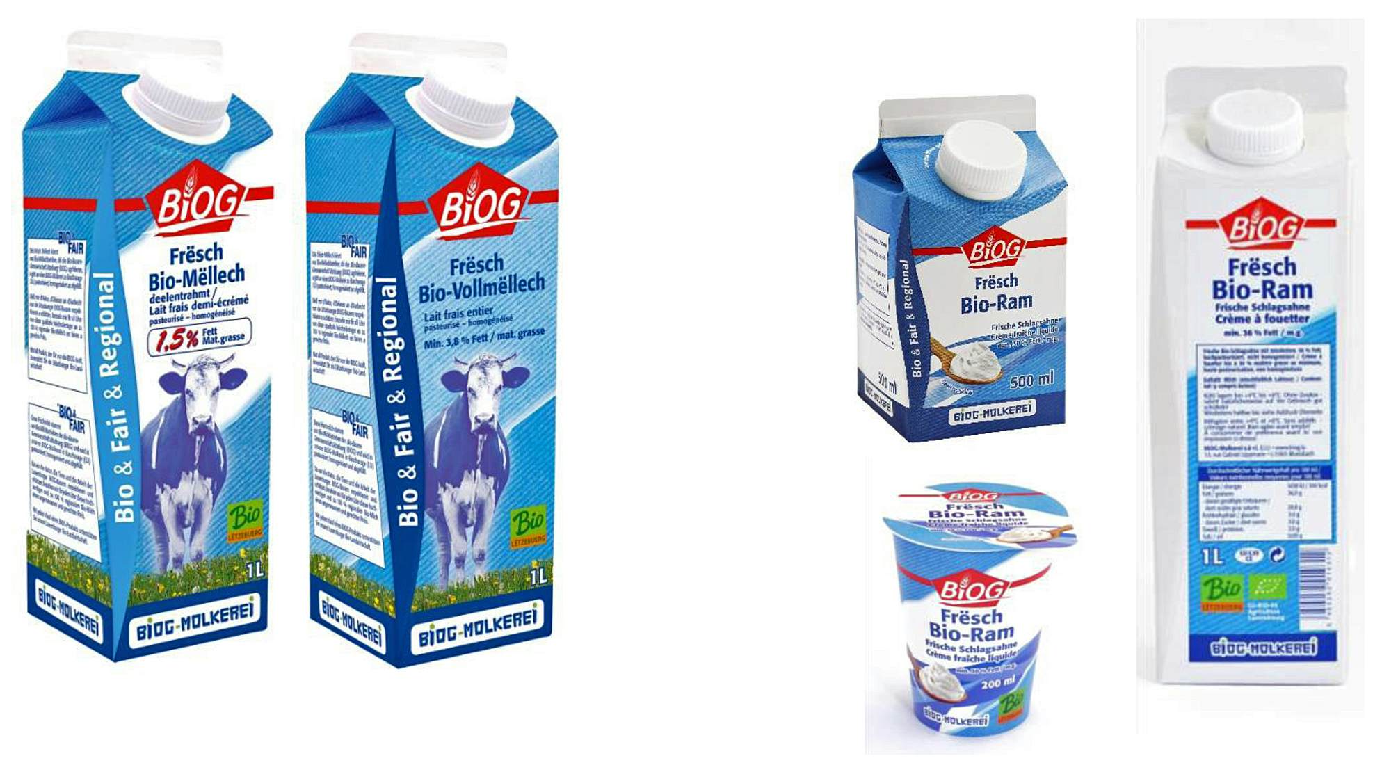 The “Frësch Bio-Mëllech” with at least 3,8% fat content is produced both for the BIOG brand as well as for the house brand of the Luxemburgish retailer Cactus. The semi-skimmed milk with a fat content of 1,5% is marketed exclusively under the BIOG brand.